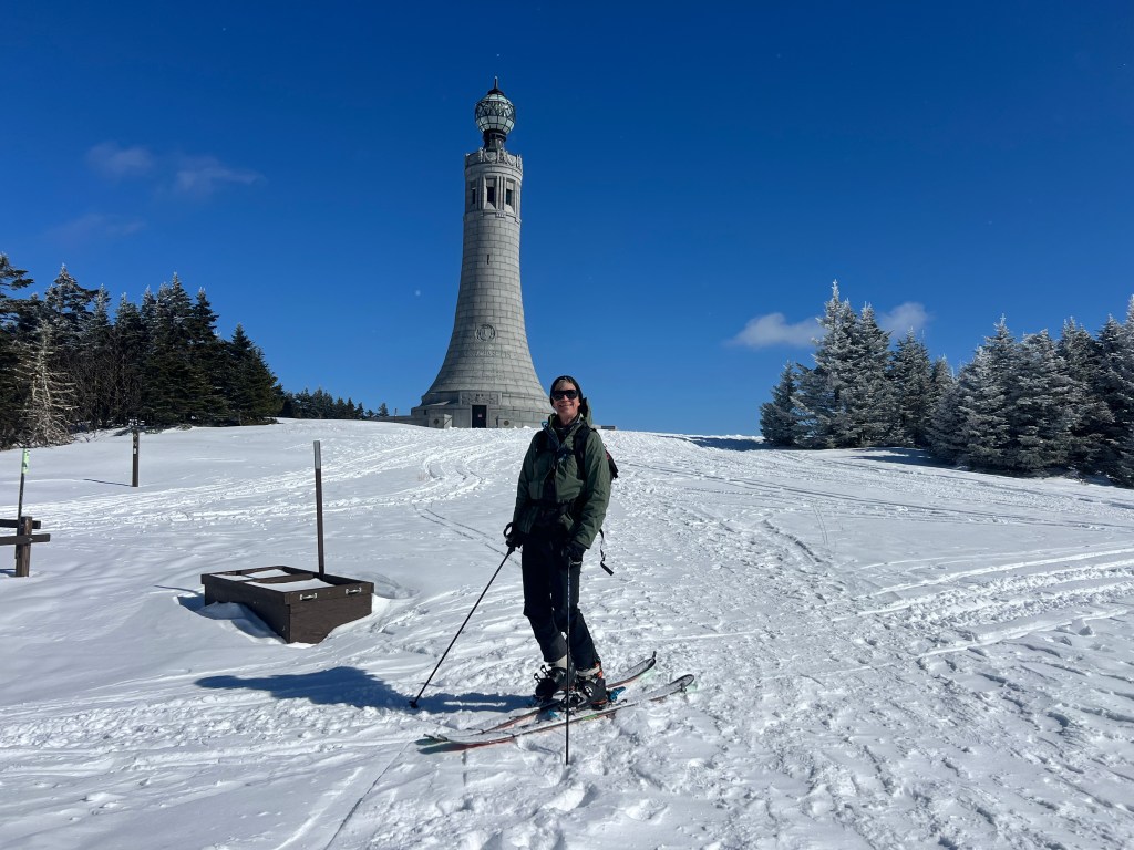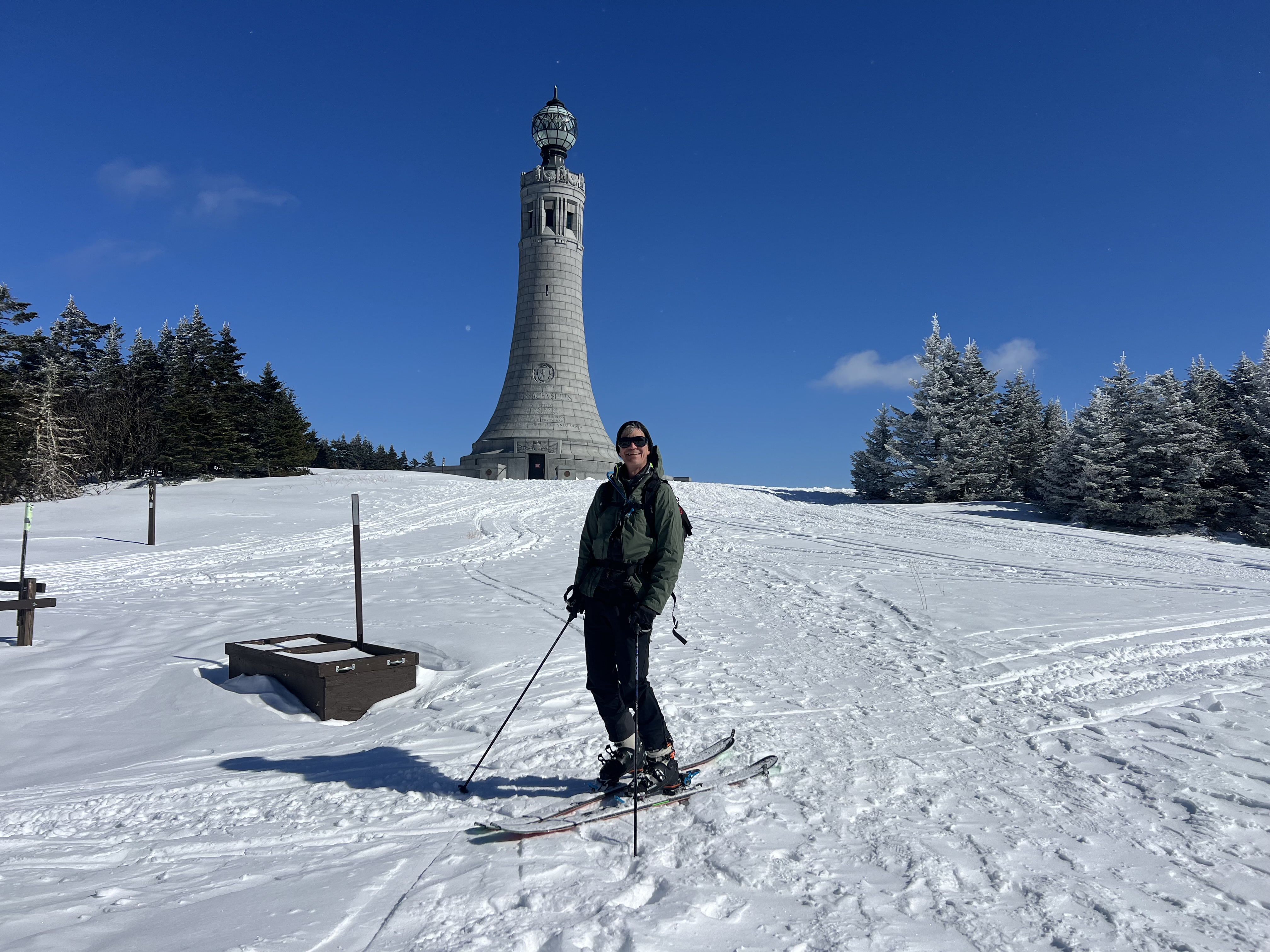 WHAT A GREAT DAY I HAD – Son, David, called last night, “Dad I am going to hike up Mount Greylock and ski down tomorrow. Like to meet me as I drive home to catch something to eat?” Did not need to be asked twice. He had not been up Mount Greylock in 35 years, but as you know I have stayed at the CCC Lodge there three different times – and enjoy it. I had a trip planned the end of the week to that area, scrubbed that plan, and headed off at 11am this morning to “scout” books. At 3:30, as he was heading back to Boston, we met at the Farm Table in Bernardston — and had a great time and meal. When he got to the top he texted me this image with the War Memorial Monument.