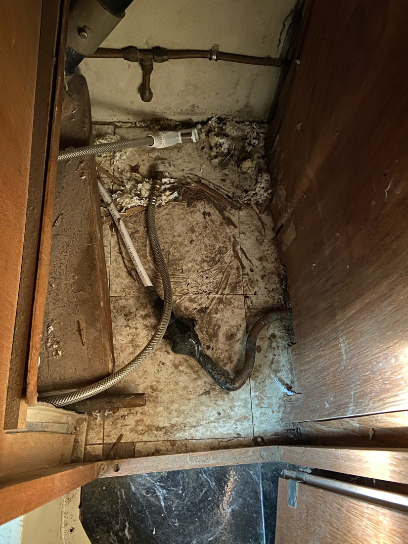 Note here – the open lines connect to the toilet. But see the line to the forward water tank that has been taped. I believe this was a spot that leaked, and caused the problem shown next. Yes, on the floor is the original tile.