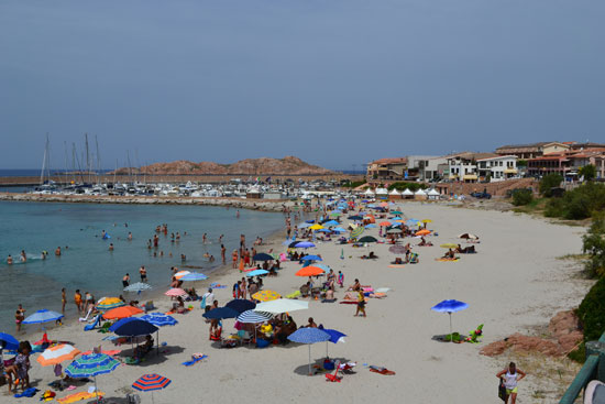 Now this is a “beach holiday” for the kids, I am not really a beach person, but am easy to “go with the flow” for the experiences and memories. The beaches are magnificent. We headed to the closest one and had cappuccino at the covered snack bar on the water, and then hiked off towards the red rocks (remember, Isola Rossa – RED) to a more secluded area. I joined them in the water but eventually sought shade under an outcropping of rock. It was a relaxed day awaiting the adventure on Monday when we drove East to Palau to rent a boat. David and Mari had done this before. The plan was to explore The Maddelena Archipelago and circle the islands of Budelli, Razzoli, and Santa Maria. We stopped in one busy cove with fabulous sands and water, and then headed off to a more secluded spot to have lunch which we brought along. The kids enjoyed a swim, and adventure came when Lisa caught a small octopus and brought it on board. It was not happy and worked hard to escape, which David helped with. Eventually I will get some of their images of the adventure. Corsica was off in the horizon, and as isolated as we were there was an ice cream and coffee vendor boating around. We arrived back to the port at 6PM, walked around this typical tourist resort village and had a lovely dinner before heading back over the mountains. I should interject that to get anywhere you must go over the mountains, even to the neighboring coastal village.