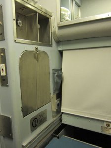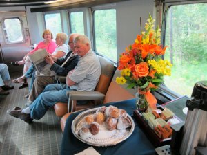My bed slides out from underneath the roomette next to me which is raised from the floor level (the bed in the adjoining space then folds down from the wall – I had to ask, but thought so intuitively).  Each sleeper car is laid out with different arrangements with either berths (basically open seats that make into upper and lower beds – remember the classic I LOVE LUCY SHOW?) and cabin arrangements.  We also have three economy class cars which are just seats, no meals, no amenities (I walked through today to see), and I also learned that there are 310 passengers with just over 2/3 in the sleeper cars.  There are three dome cars, two dining cars, a snack car for the economy class, and the last car is the Park Car – a deco curved lounge with another dome. Well, you can see that I have so much to share it is easy to digress.