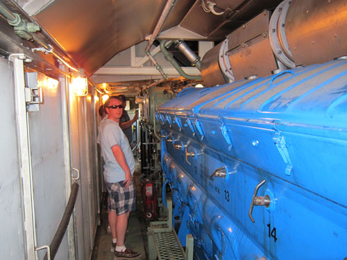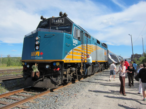 We stopped at about 4PM at Hornepayne (population about 1200) which was started as a railway town, but now serves the pulp and plywood industry.  Many such towns were built because the steam locomotives would require water and fuel every so often. It was a twenty minute opportunity to walk the train and explore.  When I got to the engine I saw a couple fellows climb up into the cab.  I know enough not to ask, so I followed along, and the engineer started showing four of us around the cab, and then motioned us back to see the diesel engine.  Shortly he had to move the train forward for the “honeywagon” to make a new hookup, so we exited. I am sure this visit is not allowed, so don’t tell VIA RAIL.
