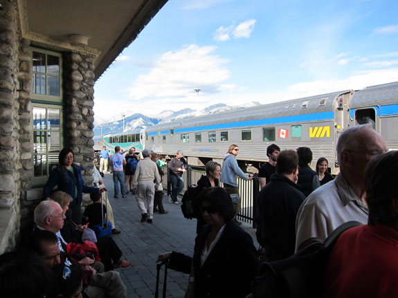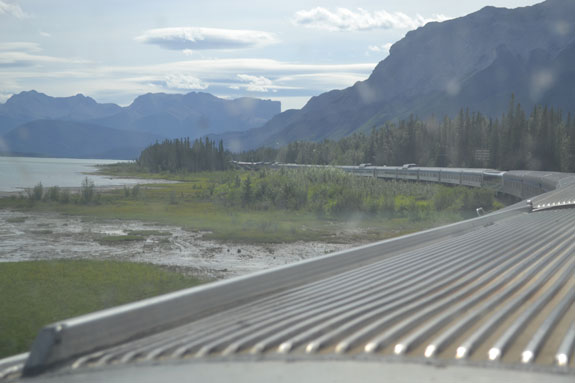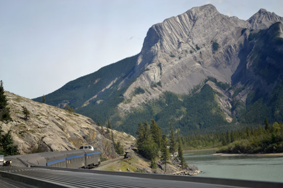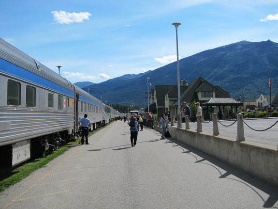 When I re-boarded shortly after 10 I headed down to breakfast, afterwards I walked down to the Panorama Car and enjoyed the views while reading for awhile. Finishing a light mystery there I then studied a camera manual in my room before heading back to the Dome Observation with another book to watch the views entering the Canadian Rockies as we approached Jasper. We arrived in Jasper, only 3 hours later than scheduled, after side-tracking for even more freight trains.