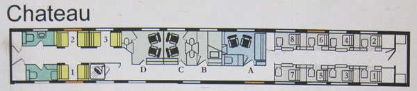 My roomette is Number 6, and you can see there are a few cabins, and on the left are berths (shown in yellow) which are beds at night, and folded up to be seats during the day, but only if the both occupants agree to that I understand.