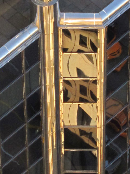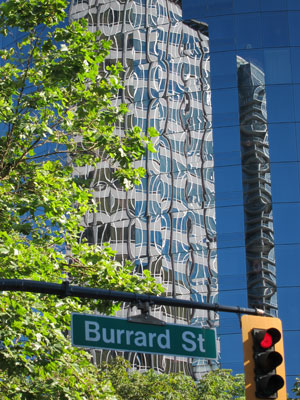 I rode the “Red Line” and when I arrived back at the Canada Center I headed to a restaurant for a bite to eat since it was almost 3PM, long time since breakfast somewhere in the Canadian Rockies. And then walked back to the “trolley stop” and got right onto the “Blue Line” trolley which travelled downtown, though Stanley Park, along the beaches, and back through downtown. Downtown is one new skyscraper (small) after another, and I have a “new” photo hobby. The reflections in the buildings’ windows are unbelievable, and I will share a few with you. When I returned I went up the VANCOUVER LOOKOUT atop the Harbour Centre Building and was it ever worth it. From my research I knew what I was looking at, but the plaques describing the views really helped me with the history and development of the city.