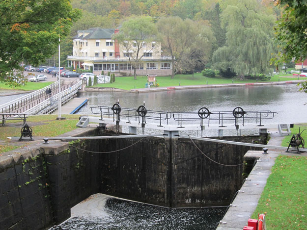 I travelled down the back roads finally arriving at the Hotel Kenney at Jones Falls. I entered the lobby, the fire was burning, it is spacious with many sitting areas (I am in front of the fire now, “ala Red Lion Inn) and checked in only to find that I was assigned to one of the out buildings on the water built in the 1970s. “Isn’t there a room in the inn?” I inquired (no, not what you are thinking). “Yes, but it is on the third floor, would you like to see it?” And it is just what I like, old (but clean and tidy), crooked floors, and a view right overlooking the canal locks. I later walked over to the Chalets – I made the right choice.