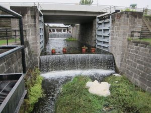 There was plenty of time there so I ran out and took a short walk to see the abandoned three combined locks (now a water garden) and the adjoining replacement single automated lock.
