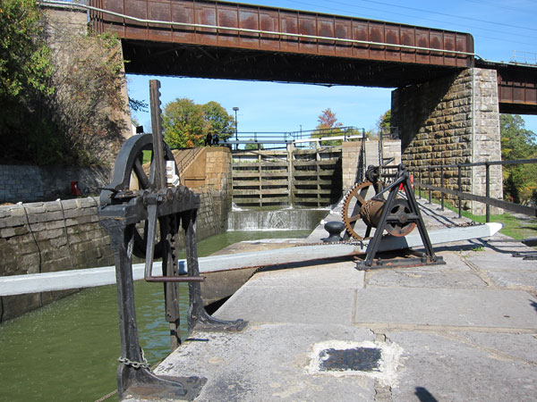 After Brian’s lecture we boarded the bus and went to the Kingston Mills locks with our box lunches. It was a perfect day for a picnic and an absolutely gorgeous setting. The last set of locks before Kingston this four lock station has a combined lift of 45 feet and also served as a military base up to World War I – its location is that important. Just below another large man-made lake to balance out the slack water route, the canals are cut into the rock with the river off to the side, and crossing over is the main railroad line first built in 1858 if I remember correctly. A Via Rail train passed over us, and I recalled traveling on this exact track from Montreal to Toronto in August to meet The Canadian train.