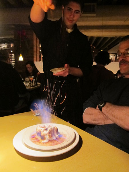 Frankie had recommended Halibut, and there was a Halibut special that Betty and I both had.  Between appetizers, salad, and our main course only Rich ventured forward with desert – Baked Alaska, and here he is looking like a King as it was ceremoniously presented to him.