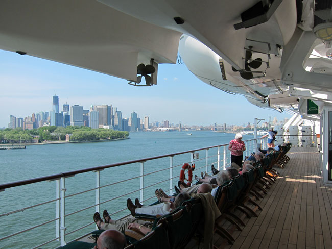 I left Bellows Falls by Amtrak train shortly after noon on Monday for a 6 ½ hour trip to NYC’s Penn Station where my son Gary met me at the station. We then took the 7:11 NJ Transit train to my daughter Julie’s house for the evening. The kids were already asleep, but we were all up by 6 AM and I had some time to play with Nikhil and Devi before he went to playschool and she to a music class. About one on Tuesday Gary drove me back to the city, crossing Manhattan and the Brooklyn Bridge, and then to the Brooklyn Cruise Terminal. It was hot, traffic heavy, but an uneventful and easy trip. Check-in at the terminal was smooth and before I knew it I was in my stateroom, unpacked and off exploring after a bit of lunch. Sailing time was shortly after 5 PM, and heading out of New York harbor is something that must be experienced.