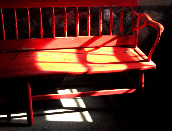 thoroughly pleased with the class sessions and the comprehendible presentations Arnie made. So, after lunch I retreated to one of the stone buildings with my laptop, class notes and cameras to review my notes, and then review my images hoping to figure out what I needed to do before my one on one with Arnie Saturday morning. I indexed what was key to me including the overview he gave us Friday morning on adjustments that can be made with Photoshop, which sadly I never taken the time previously to explore. After about two hours I began reviewing my images many of which were experiments with camera settings on both my Canon S95 and my Nikon D3100. I was getting happier with what I had taken, and there were a few that I liked except for the exposures and colors. I thought, “let me try what I learned I could do with Photoshop.” So after another hour of playing with a couple images in Photoshop I was pleased with my “class portfolio” of ten items. It was time with my attention span (I have to walk away from a project to think about it and solidify what I learned) to stop, so I pushed back my chair and WOW, there was an image with light on a bench I wanted to play with.