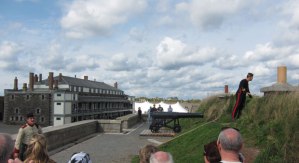 Citadel for the firing of the noon cannon.  For over 200 years the cannon has been fired daily (except on Christmas) to signify noon to all Halidonians.  Once done I saw a 15 minute video on the history of the fort and then watched a 45 minute presentation called the Tides of History covering all of Halifax’s maritime history.  Samuel Cunard, in fact was born here, and was the one who replaced sail with steam establishing Cunard Lines of which Queen Mary 2 is the latest ship.  I figured I really could not tour the fort because of “cruise-time” again (not that you have seen one, you have seen them all), but I am pretty familiar with fort history, so I walked outside the gate and the “hop-on hop-off” bus was just leaving but stopped for me as I called out, “one more please.” Timing!