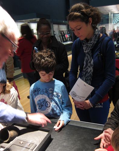 the Japan exhibit with the samurai accoutrements, the Etruscan room, and then saw the coin room and were fascinated by the clock exhibit. In the coin room there was a hands-on lecture volunteer explaining and letting people touch actual museum pieces. Lisa and I saw that on the first floor there were a number of such hands-on experiences and we took Alex there where a very knowledgeable woman shared almost a million years of history with us starting with a fascinating stone implement.