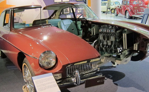 production.  Shortly after I bought Black Beauty I purchased by mail my “Heritage Certificate” providing all the details of when she came off the line and with what features and accessories.  For her I also know what ship she arrived on in the states and the dealer she was delivered to in NYC.  So Ray thought, “wouldn’t it be great to see if I could get Blue Belle’s build record (let me call it “Birth Certificate”) in person.  I arrived at the museum about 1 PM, and my first stop (well, after the WC) was the archive room.  Yes, Steve, John, Butch and David C. at Sports Car Services in West-West, I had my chassis number and motor numbers with me.  I went in and handed my numbers to the researcher there and he went back to some rolling stacks. After pushing a few he selected a large black metal binder and brought it over to the counter and started flipping pages in front of me.  The left hand column was the chassis numbers, and the columns to the right had codes for paint color, interior, wheels, heater, etc., along with rubber stamps indicating the date of assembly, completion, and leaving the factory.  But for MGs the shipping records were not kept.  He said he would be happy to prepare my certificate if I was going to be there a few hours at least.  “That is the plan,” I replied, and he collected my 40 pounds, and off I went to eat and then tour the museum.  Now I will admit, I had the parochial viewpoint that I was going to see nothing but sports cars, like one of every Triumph and MG made.  Not the case, the sports cars were in just one smaller second level area (I have lots of pictures for Sports Car Services and anyone else interested).