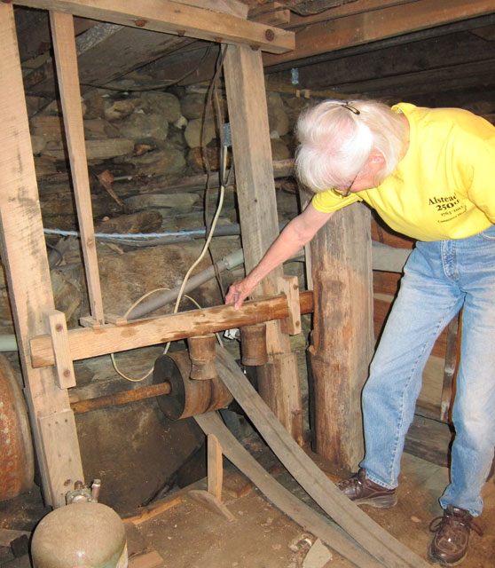 Dan greeted me outside the mill, and then I was fortunate to have Margaret Chase tour me through all three levels. Dating from 1917, this is the third mill built on this foundation. Her Dad, Heman Chase, operated a woodshop here giving lessons to area children in the 1960s and 70s using water powered equipment which is still extant and operational. The flood of October, 2005 did knock out part of the metal culvert to the turbine, but otherwise the mill has been untouched for decades. The newly organized Mill Hollow Heritage Association is endeavoring to restore the mill and