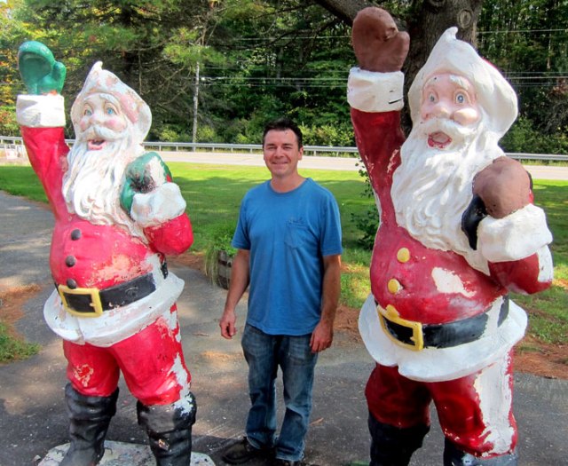 I stopped at Santa’s Land in Putney, Vermont today, hoping to catch the new owner. I found him and his teams hard at work. But he stopped work for a while touring me around, and chatting with me for news articles I plan. Below is David, our new “Santa” with the Santa from atop the main sign, and the second from his spot in the field near Rudolph.