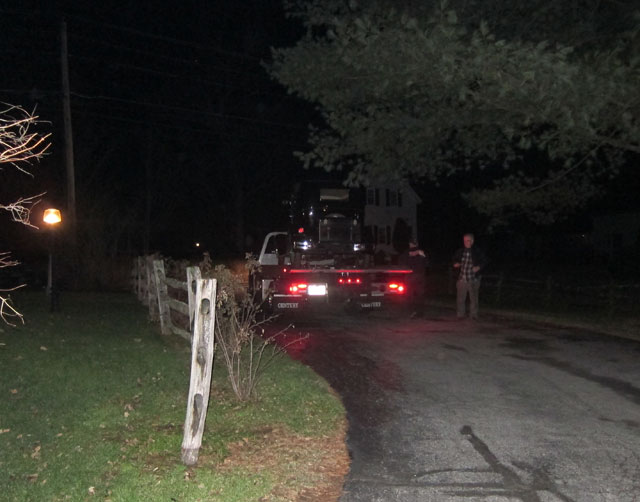 Earlier today Steve and I arranged that my new “Lady” would leave Connecticut at 5 AM tomorrow, Saturday, and arrive in Walpole about 8 AM. I spent the afternoon visiting around town, but had heard on the news at lunch that snow was impending for Saturday. When I got home there were many phone messages and an email from Steve that they wanted to come immediately because of the snow. I immediately replied, “fine.” Rob and Barbara graciously earlier offered the use of their barn, and also invited me out to dinner this evening. “I would love to go, but this is my last night home for over ten nights and I need to veg out,” I told Barbara. So, when I got home and found my new “toy” was soon to arrive, I called Barbara and said, “and another reason I cannot join you is she is coming now.” Rob called back saying he got the barn ready. At 7PM Steve called, and they were just across the river. I met them on Route 12 and they followed me to Rob and Barbara’s. And below is the unloading and tucking in. Now to get my stable at “44” modified to keep my girls in constant view. The saga continues.