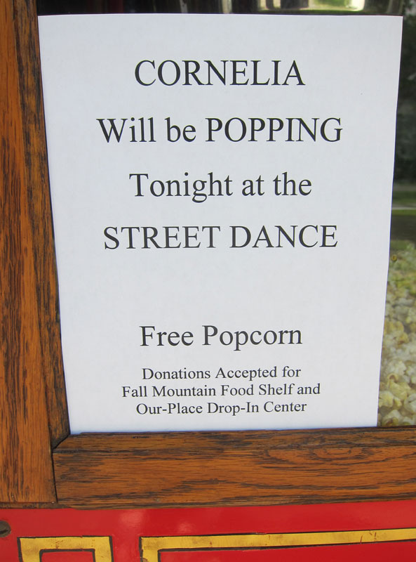 Thirteen plus years in the making, but worth the wait.  One of those “crowning moments” in my life.  CORNELIA (aka a replica of a 1906 Cretors No. 2 Sidewalk Popcorn Wagon) finally popped away, and for a good cause.  I did not want to “sell popcorn” but wanted to give it away for a donation to the two local food shelves – The Fall Mountain Food Shelf, and Our Place Drop-In Center.  These two organizations have received our A CHRISTMAS CAROL audiences donations the past six years — now over $20,000.  And, this evening (thank you Walpoleans) CORNELIA received a tad over $300 in donations for these worthy causes for almost 300 servings of popcorn.  I brought my stool along to sit down – and never was able to sit once. What can I say further?