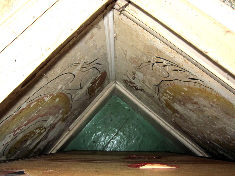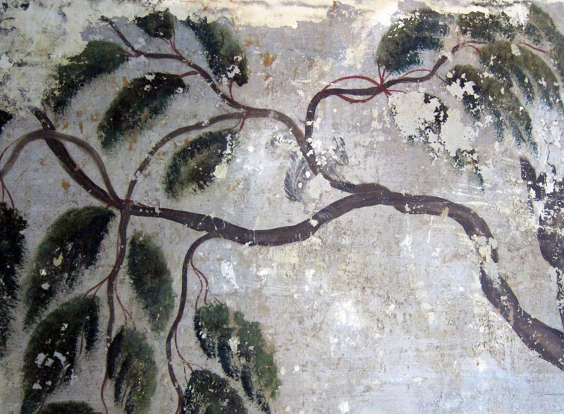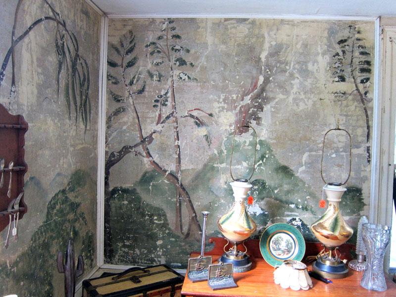 I explored the barns and went inside. And to my pleasant surprise, there in the room to the left were original RUFUS PORTER style wall murals – WOW. Owner Chris was very gracious and said that I could go get my camera. Recently a muralist scholar had visited and identified the artist, but he could not remember the name. That artist had not previously been seen this far west, and the grapes in one panel was a clue. As you may know, it was my following Rufus Porter’s work that brought me to New Hampshire, and my dining room walls have been painted in the Rufus Porter style.