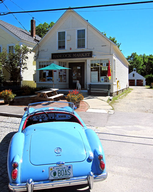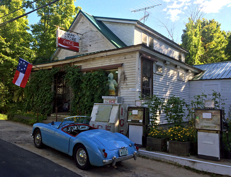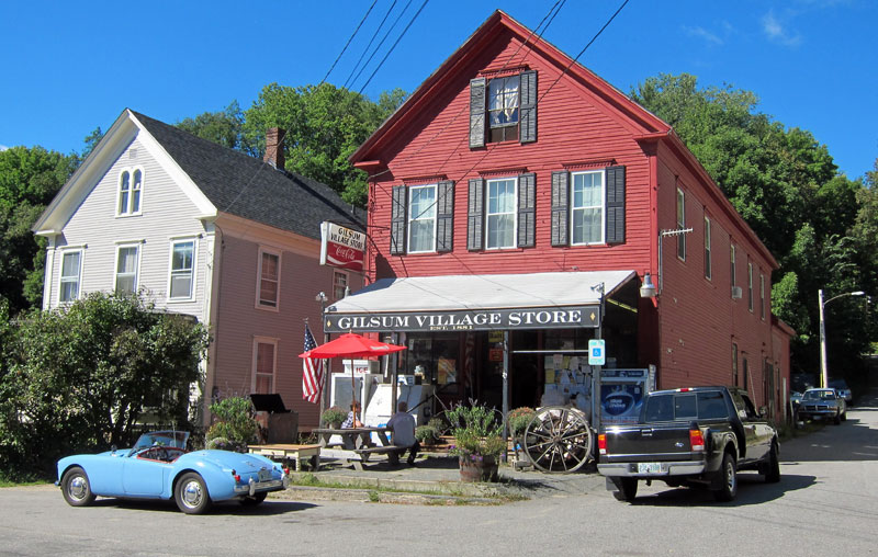 I first headed over the hills of Walpole, then down 12A to Surry for the cutoff along a fantastic river (no guard rails, no speeding here) to Gilsum. Knowing I like country stores, BLUE BELLE wanted to stop at the Gilsum store for a “selfie” (a pattern she demanded for the day).