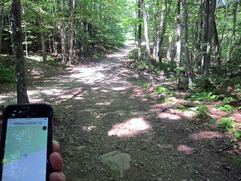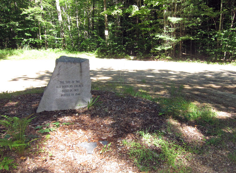 The road sort of ended at the church site and was posted. BLUE BELLE was worried about her low slung exhaust system, so she stayed back as I hiked along the path that the maps app indicated was a road. Soon, according to the maps app on my iPhone coordinated with GPS — I was at Roxbury Center at the junction of five “roads.”