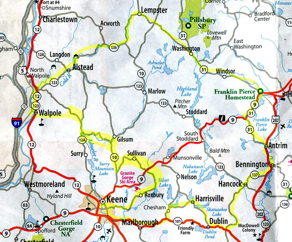 but when I got to Route 10 I realized that I had highlighted on the map a back road that I had not taken – bummer – and had not found. So, I just continued south on Route 10 but decided not to cut over on Route 123A that you hopefully saw I had highlighted. A couple years ago BLACK BEAUTY said, “never again, my bolts are hurting.” So, at Marlow I turned right on Route 123 (not much better, but not as far as wash-board) to head back home.