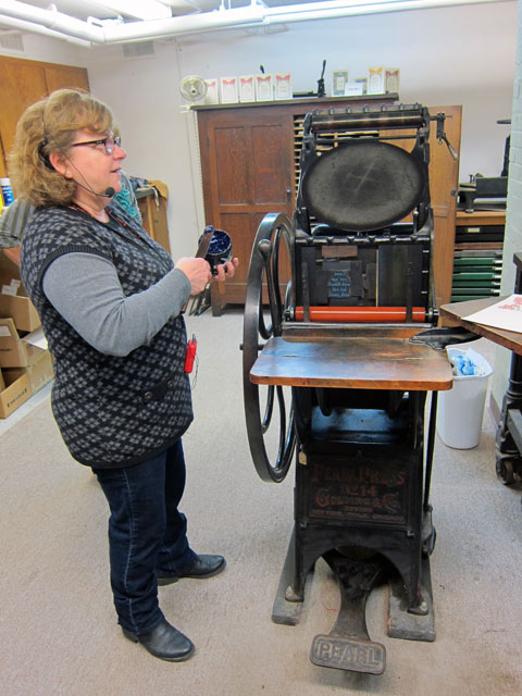 which was followed by a printing demonstration in the Roycroft Chapel (I know more about letterpress than that young lady). Next we could try our hand at hand-illuminating a printed work. Lunch was then at the Elm St. Bakery.