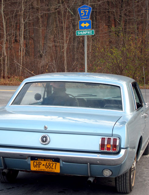 No, not the Mustang. I told you I am out of my Mustang phase. Enjoyed my 1966 Hardtop and 1965 Convertible in the 1980s.  Remember, I am now on a quest for a 1964 Corvette (leads to a purchase rewarded).  Rob said he saw the driver turn around frightened when I jumped out running up.  Hey, anything for the right photo – of the sign, silly.