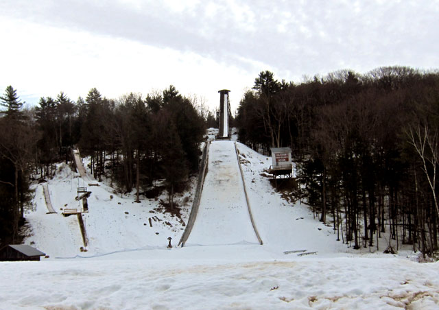 south to Salisbury, CT. This is a route I highly recommend, the views great and extensive without leaves (especially southbound). Even with leaves off the trees the STAGECOACH TAVERN is still hard to spot. With the leaves off I saw something strange in the distance, and homing in on it discovered the Salisbury Ski Jump – of all places.