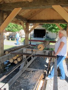 - And, I just love the permanent “historic village” on the hillside of the Fairgrounds. Here they are drilling wooden water pipes.
