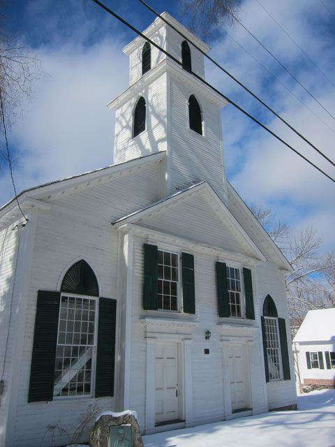 Built in 1837, the stone with the plaque in front of the Guilford Center Meeting House commemorates the first president of Tufts University. Note the staircases crossing the front windows. I cannot wait to get inside this structure.