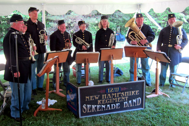 Festivities were to begin at 1PM with music by the 12th New Hampshire Regiment Serenade Band. I put my picnic basket back in the “van” and headed up to the tent set up for the festivities, and shade. It is sad to be alone, but good often because one empty seat is always still available in the first (or second) row. The band was amazing, not only the music, but the history the gentleman on the right gave on Civil War music and bands at war.