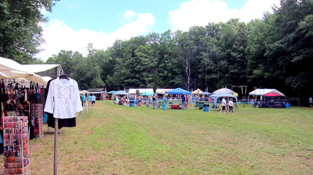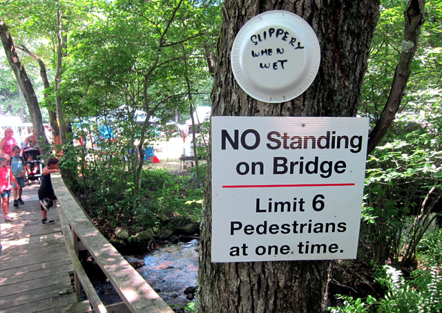 With festivities beginning at Noon, we arrived with our chairs at the scout camp early to get a good seat. After reading and heeding this warning, we crossed this bridge into the open area for the ceremonies and ubiquitous vendors.