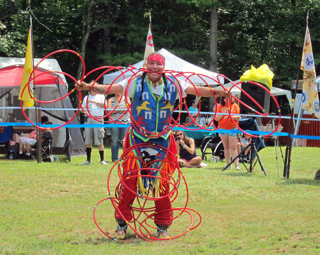 Everything was pretty much the same, with the public invited to join in. We heard a “hoop dance” was coming, so waited for that – fascinating. Matt White Eagle, from Canada, travels all over the country to perform. He dances and uses increasing numbers of hoops (originally made of a white ash, but painted red) to intricately present recognizable designs.