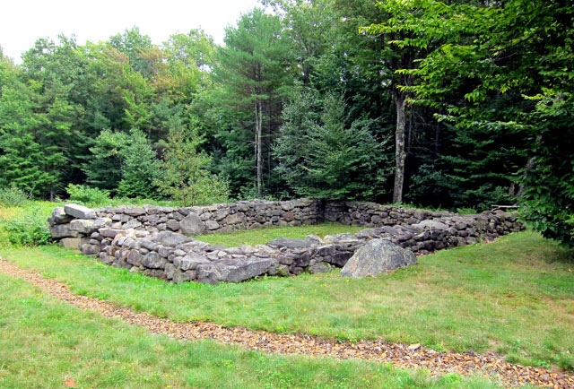 At the edge of the village site (walk from spot above towards the mountain) is the Town Pound. Found in most colonial villages, the pound was for impounding stray farm animals. A farmer could reclaim his animal paying a fee to the Pound Keeper for the animal’s care and feeding.