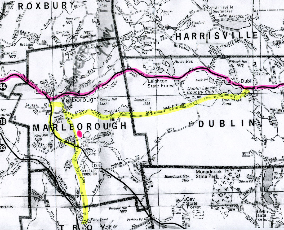 Back on Route 101, and heading west through Dublin. Up the hill, around the round-about at Yankee Publishing, up the hill, and coming into the curve at Dublin Pond. BUT WAIT !!! How many times have you gone east to west, or west to east across New Hampshire on Route 101? How many times have you looked across Dublin Pond from 101 to Monadnock Mountain? Have you ever wondered what was on the other side of the lake? This time I did – and turned onto East Lake Road. REMEMBER – IF YOU HAVE NOT BEEN ON A ROAD BEFORE — TAKE IT ! Checking my extensive archives this morning, I found a used map of the area to share with you what I did.