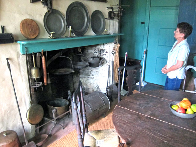 The docent told the history of the house, and the changes over time. In housing their collections, the various rooms are furnished reflecting different centuries as they would have appeared. Below is the 17th century kitchen with some interesting implements with clock mechanisms for roasting. One is on the wall above the mantle on the right, and the other hanging from the mantle on the left.