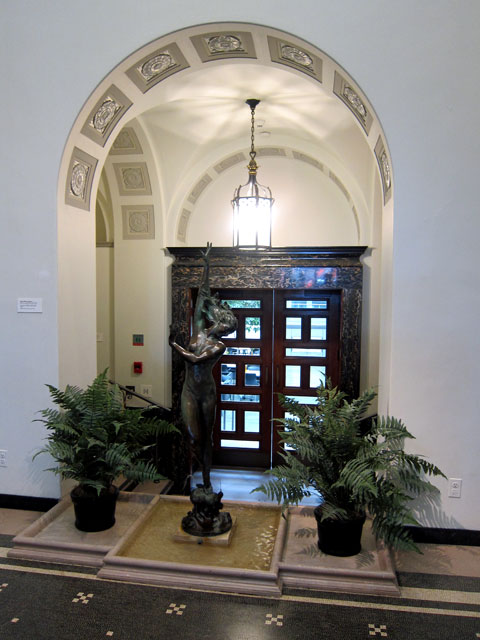 Hannah Slade Currier, who died in 1915, married Hon. Moody Currier, a distinguished banker in Manchester, New Hampshire. 1885-6 he was governor of New Hampshire. When she died, she was one of the wealthiest women in the State of New Hampshire. She left her estate to establish the Currier Gallery of Art. I first had lunch in the cafe, passing through the older section and this entranceway.