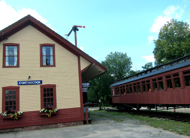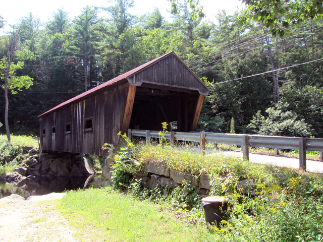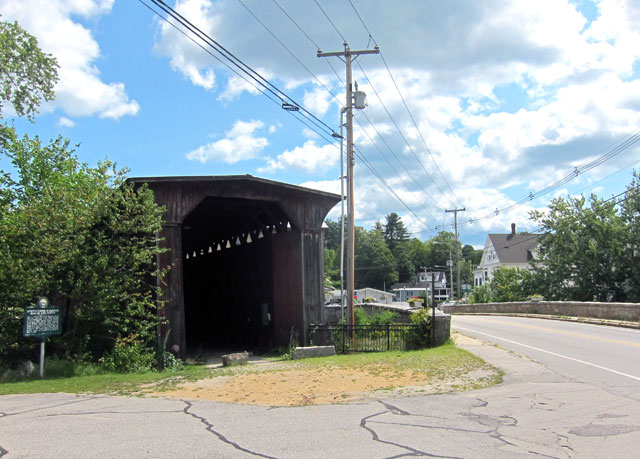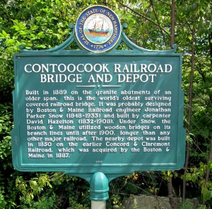 house there, and invited me to pick what I wanted. Arriving there at 10, I finished up at noon. My plan, since I was already across the state (time for this adventure does not include time it took to arrive at the start, or travel home from the end), was to explore a few towns I have missed. DO NOT MISS Hopkinton – it is a delightful small colonial village lasting but a few blocks. Ultimately I wanted to see the Muster Field Farm Museum in North Sutton – and the back roads to take were NH 102 and 114. The first stop was Contoocook Village in Hopkinton where I had lunch.I realized that on this route I could share three covered bridges with you. You can click on the image to the right (above) to read the importance of the bridge below. Hopefully you get the sense of the height to accommodate a puffing steam locomotive.