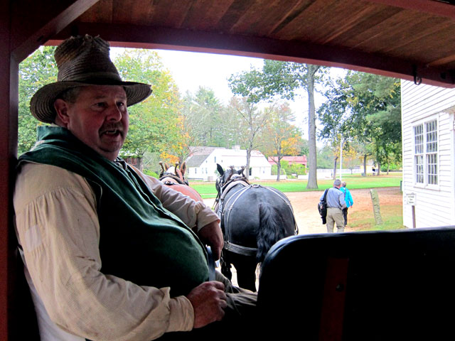 I like to start an experience with an introductory video – there was none in the visitor center, but there was a great exhibit on the Wells family. But, I read of horse-drawn carriage ride through the village and farm area, and arrived in front of the Asa Knight Store (relocated from Dummerston, Vermont, just miles from home) just in time to join George and his team for an overall view and history.