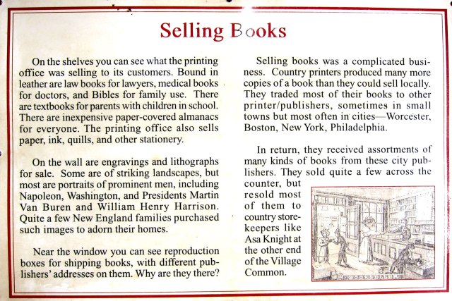 Every old village recreation has a print shop, but I did not realize that here was Isaiah Thomas’ shop moved from Worcester. He was probably the most important colonial printer other than Benjamin Franklin. He had a branch in my town, with a bookstore with over 3,000 books, and the FARMER’S MUSEUM, a newspaper going to all states, including George Washington. With my printing and publishing background, his branch in Walpole, is the most historically significant building in town (you may click on the image for a larger easier to read image)
