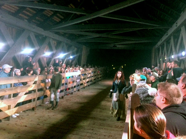 finally was a walk around the torch lit mill pond to the covered bridge and the ride of the Headless Horseman (sorry, missed a shot of him).