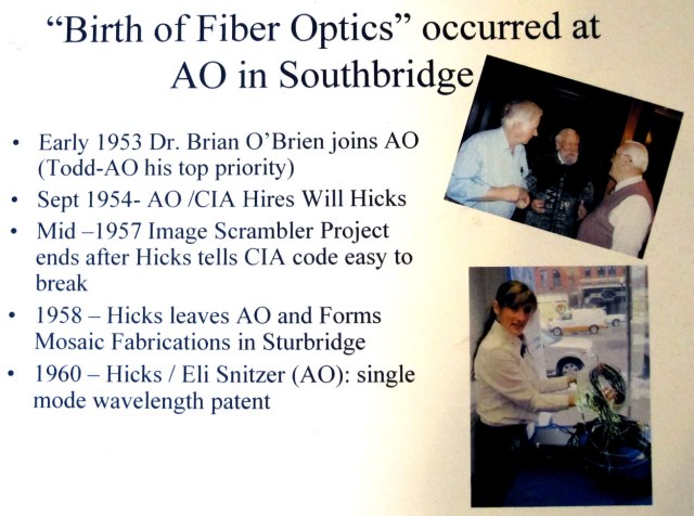 FANTASTIC – a history of glasses, and also optics from American Optical that was in Southbridge for over 180 years. If I understand correctly fiber optics were discovered there, and early lasers. Dick Whitney, Executive Director at the museum, spent his entire working life at AO since his graduation from college, and basically closed the last doors. He saved much from the archives, and artifacts establishing the first museum in the old AO plant. Now in a new location with the establishment of a convention center in the old location, Dick will welcome you at anytime to this unique and historically packed museum. Here is the entryway with Wells and early AO history.