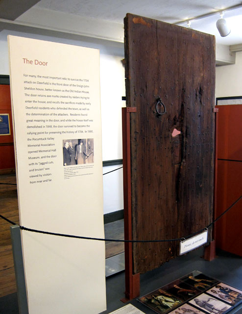 I left home in time to be at Memorial Hall Museum when it opened (remember last post I arrived there as it was closing?), the home of the Pocumtuck Valley Memorial Association (PMVA), and opened in 1870. Separate from Old Deerfield Village, the museum documents the area, and well worth a couple hours. A key relic is from the 1704 Indian Raid – The Door – and saved with the Old Indian House was sadly demolished in 1848. Prominently visible are the hatchet scars and holes.