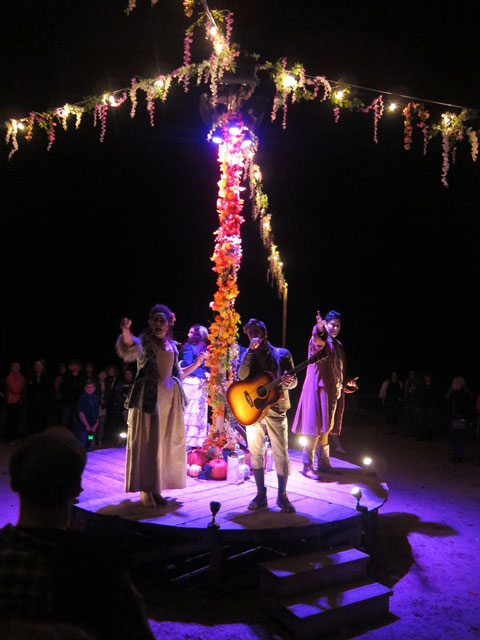 I arrived just before the gates opened at 5:30, and there was Courtney at the ticket booth. She suggested I wait off to the side. After about 38 minutes she came over and said, “follow me, someone has surrendered a ticket.” Ray’s Good Fortune. I still had time before the 7:30 performance, but no problem, I was in. Earlier in the day I saw in the mill area the production areas set up, so unlike others I had an idea what was going to happen, and that the audience would be moving from spot to spot. The introductory narration and songs began at the Gristmill.