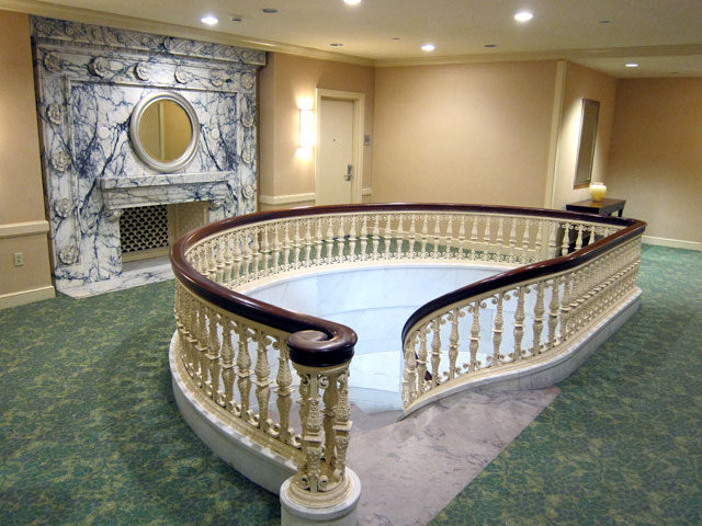 At that time I did not know what it currently was, but Dick filled me in. After American Optical closed, it was economic bust for over 3,000 employees, in a town of now 15,000 people. At the same time there were more military base closures. Bush 41 proposed plans to move Navy training from San Diego to Southbridge, and repurpose the complex here for a training facility. Clinton put on hold, and Bush 43 worked on it again. Now the Southbridge Hotel & Conference Center, it is supported by a 20 year DOD $9 million plus year contract. But the public also uses the facility. Dick told me that the center tower section is original, as is the facade. Everything else, from three feet back from the facade, is new. He said I had to see the original stairwell in the tower. I went in walked around, and was impressed.