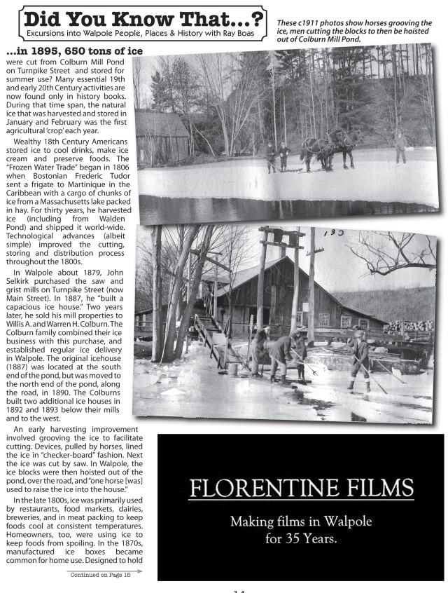 now, I have always been fascinated by all things 19th and early 20th centuries — and ice harvesting just one of those things I just had to know all about. Following my August visit I vowed to finally write about Ice Harvesting, and published one of my DID YOU KNOW THAT… articles in the December issue of my publication, THE WALPOLE CLARION. At the end of this post I will include that article.