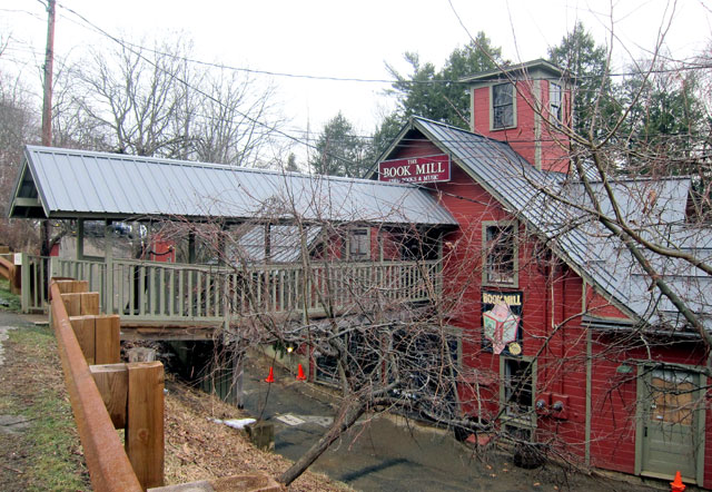 The mill dates from the 1830s. The cafe is on the lower lever to the left, and the bookshop rambles around. There is a separate building with music and an art gallery.