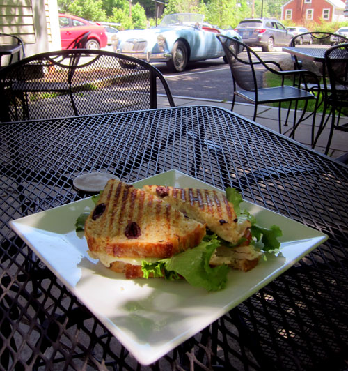 Leaving I headed down to Peterborough, and then out Main Street north to West Peterborough stopping at Nature’s Green Grocer Cafe in West Peterborough. On an outing in BLACK BEAUTY, Ms. T. introduced me to this fine spot, where you can sit on the patio over the river enjoying your sandwich with BLUE BELLE looking on.