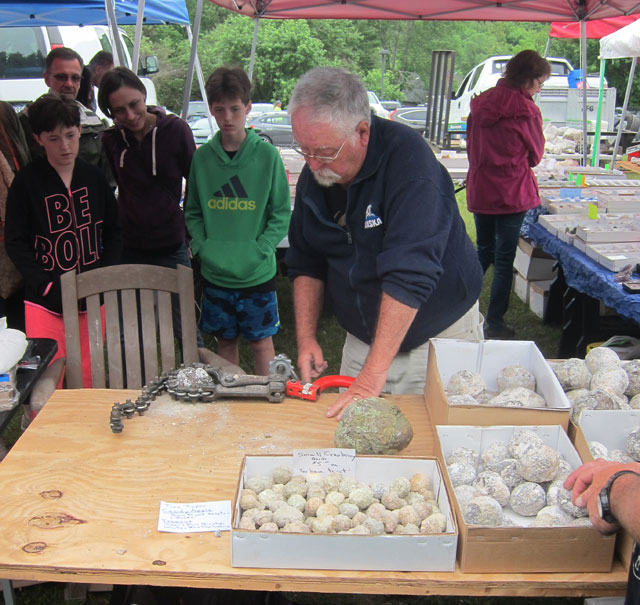I have so much I want to learn. Ironically, I had previously scheduled a week long seminar in July on the geological development of the Connecticut River Valley, and have been learning about Lake Hitchcock and the aquifers in our area. A study of rocks and fossils at the show was a natural thing for me to finally do. Below a fellow was selling geods. You could make a selection, and then he would open the stone.