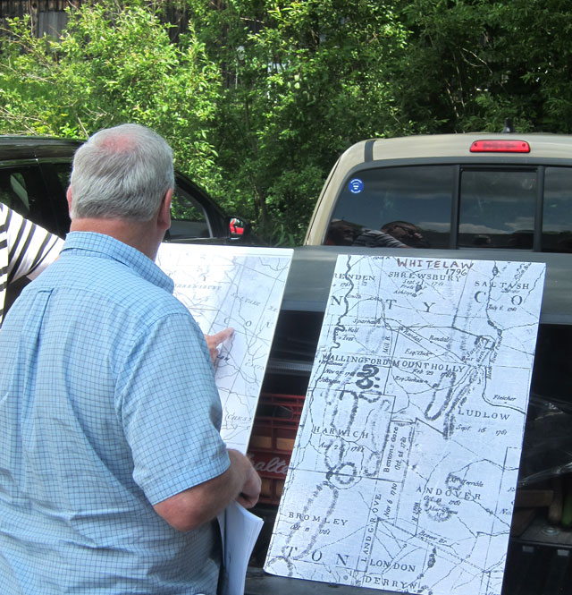 The afternoon tour was lead by Dennis Devereux, director of the local historical society. Dennis can trace his family to Greene Dawley, born in 1783, and claimed as the first white male born in Jackson’s Gore (the original name of Mount Holly which was previously called Mechanicsville – and you need to learn what a Gore is). He started the tour (14 of us in a small bus, followed by 4 cars) showing the spots we would visit on these early maps. Outlined was the original 1759 Crown Point Road, the 1776 rerouting of that road, the original Turnpike and its tolls, and the sections of the Shunpike. The current Route 103 was laid out in the 1920s, but sections improved (particularly the hill up from Route 100) in the 1960s.
